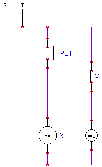 - 접점 PB1가 ON 되었을 때 릴레이 코일 X는 작동하고 릴레이 코일 X의 b접점 X도 작동하여 회로가 열리므로 표시등 WL 은 점등하지 않는다. (소등된다)