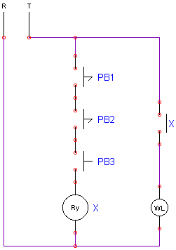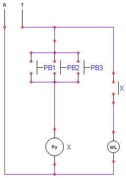 - 입력 PB1 와 PB3의 접점이 OFF 상태이기 때문에 릴레이 코일 X는 작동하지 않고, 릴레이의 a접점 X도 작동하지 않기 때문에 표시등 WL은 점등되지 않는다.