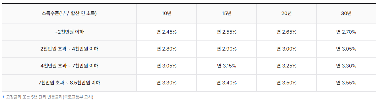(소득) 대출신청인과 배우자의 합산 총소득이 연간 6천만원 이하(생애최초주택구입자, 다자녀가구, 2자녀 가구는 연간 7천만원, 신혼가구는 연간 8.5천만원 이하)인 자