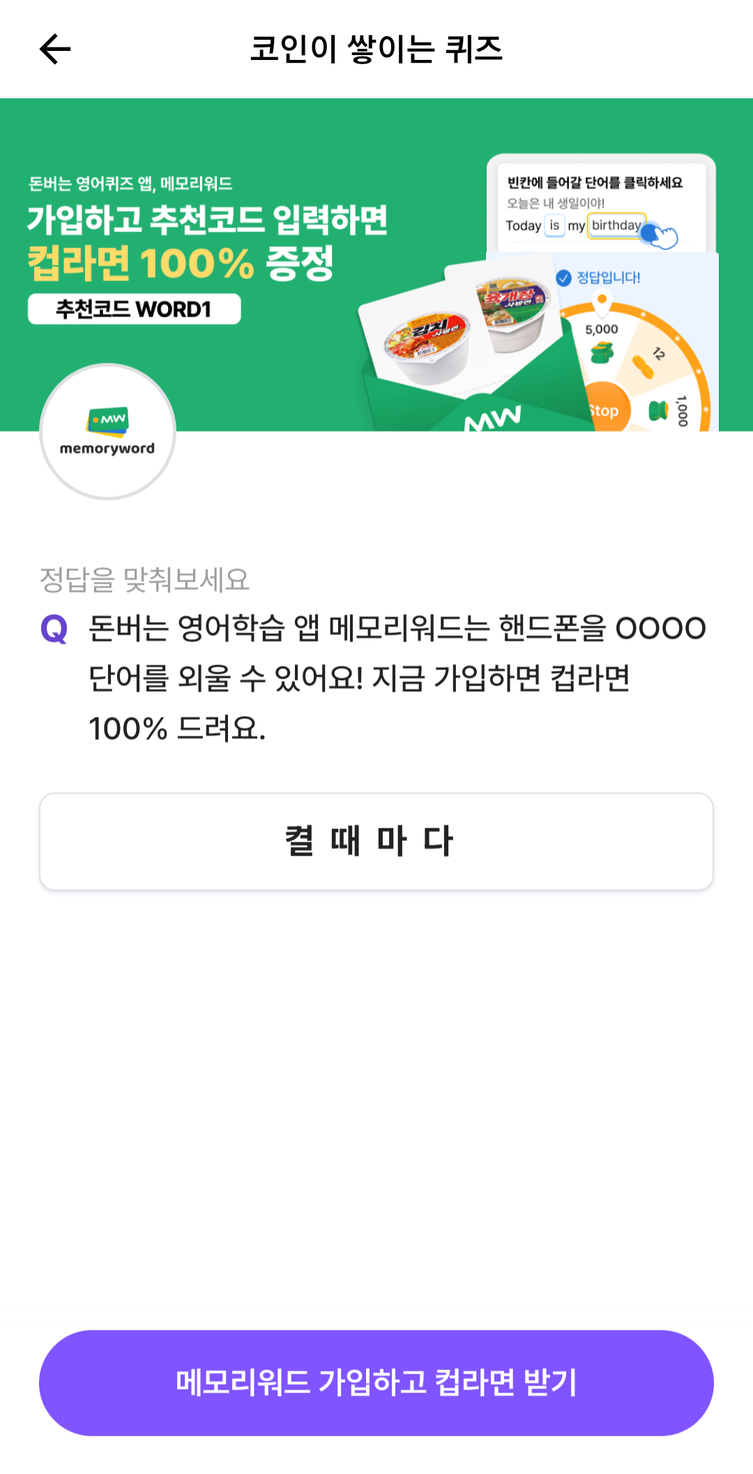 돈버는 영어학습 앱 메모리워드는 핸도폰을 OOOO 단어를 외울 수 있어요! 지금 가입하면 컵라면 100% 드려요
