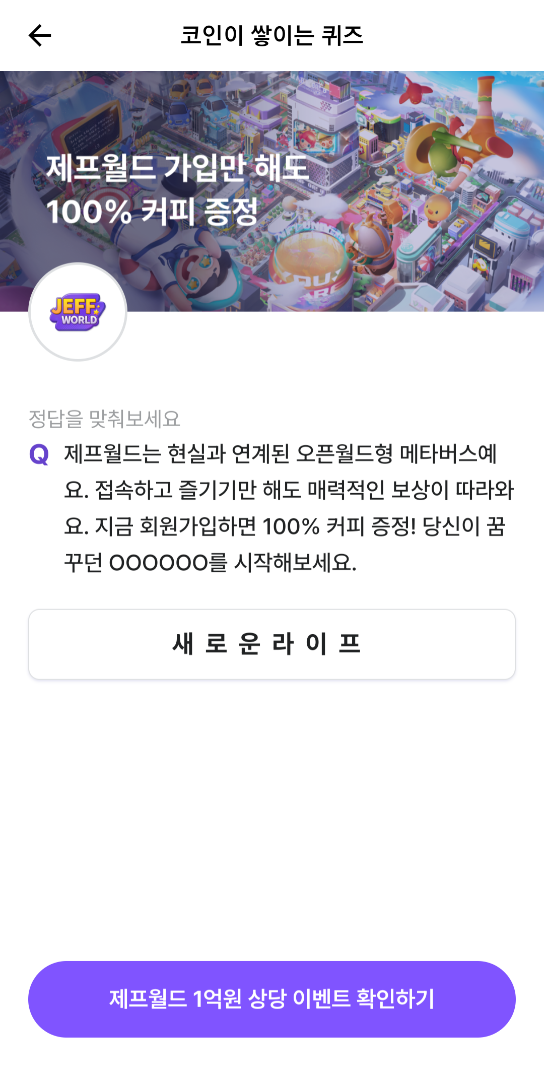 제프월드는 현실과 연계된 오픈월드형 메타버스예요. 접속하고 즐기기만 해도 매력적인 보상이 따라와요. 지금 회원가입하면 100% 커피 증정! 당신이 꿈꾸던 OOOOOO를 시작해 보세요.