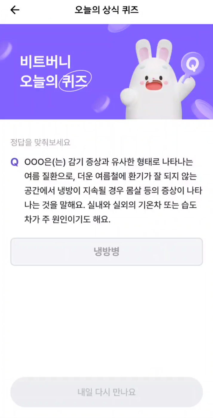 | 비트버니 비트머니 7월 28일 퀴즈 정답 ㄹㅍ (0) | 2024.07.28 |