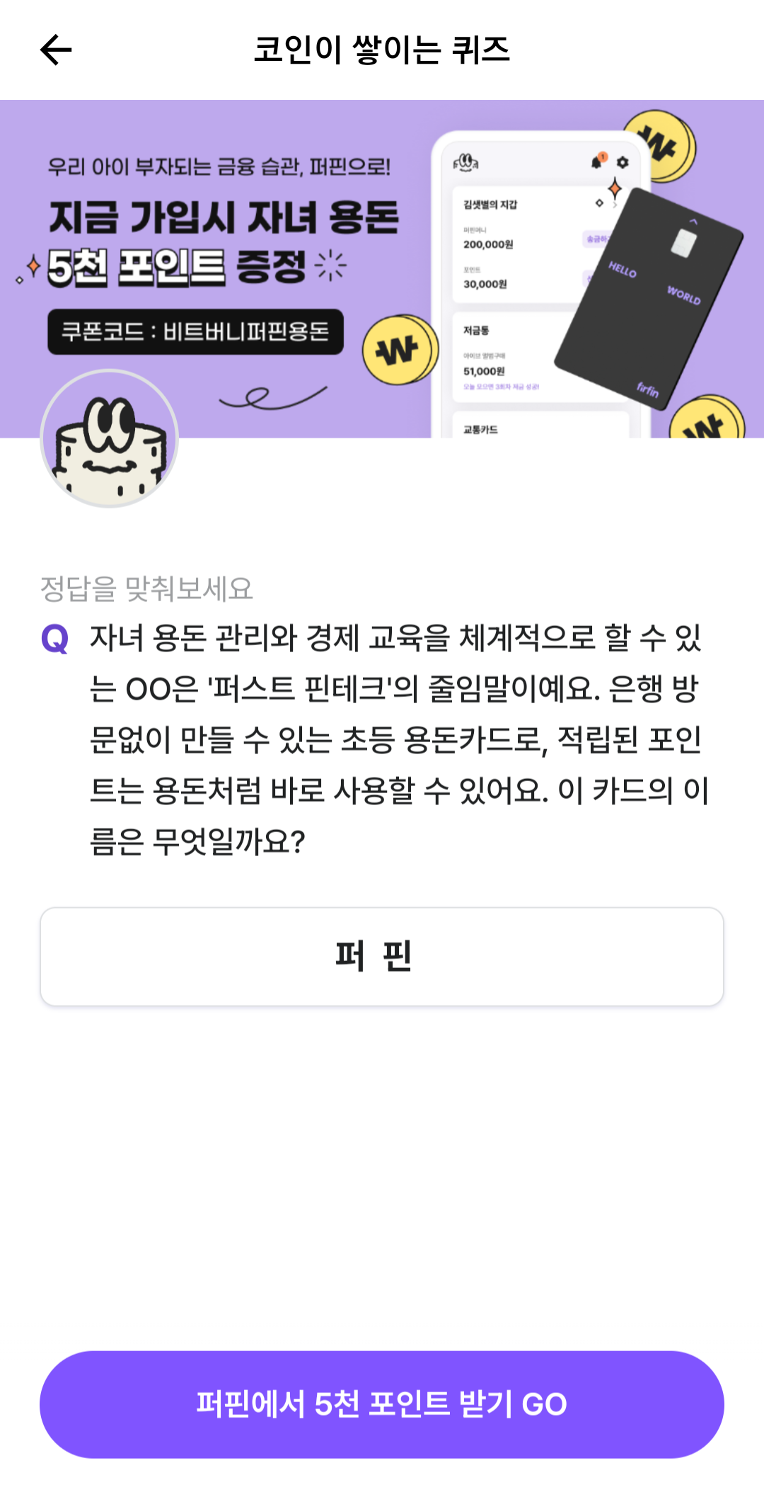 자녀 용돈 관리와 경제 교육을 체계적으로 할 수 있 는 OO은 '퍼스트 핀테크'의 줄임말이예요. 은행 방문없이 만들 수 있는 초등 용돈카드로, 적립된 포인 트는 용돈처럼 바로 사용할 수 있어요. 이 카드의 이 름은 무엇일까요?