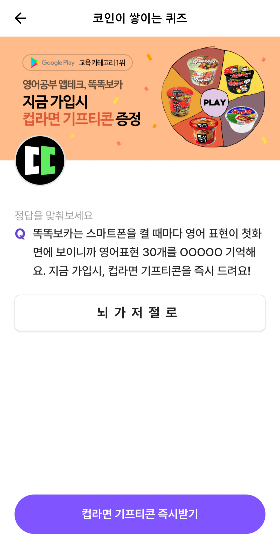 똑똑보카는 스마트폰을 켤 때마다 영어 표현이 첫화면에 보이니까 영어표현 30개를 O00OO 기억해요. 지금 가입시, 컵라면 기프티콘을 즉시 드려요!