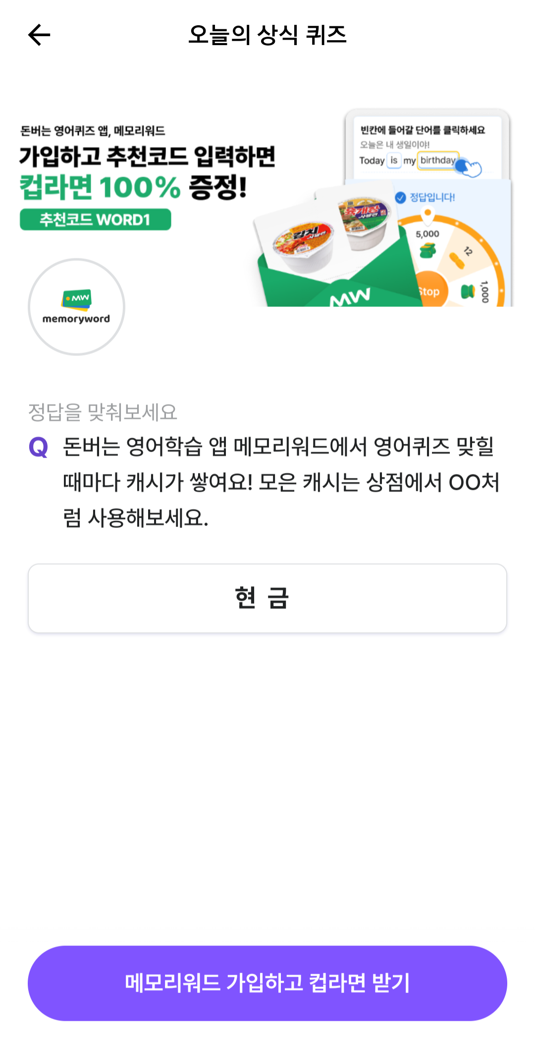 - 돈버는 영어학습 앱 메모리워드에서 영어퀴즈 맞힐때마다 캐시가 쌓여요! 모은 캐시는 상점에서 OO처럼 사용해보세요.