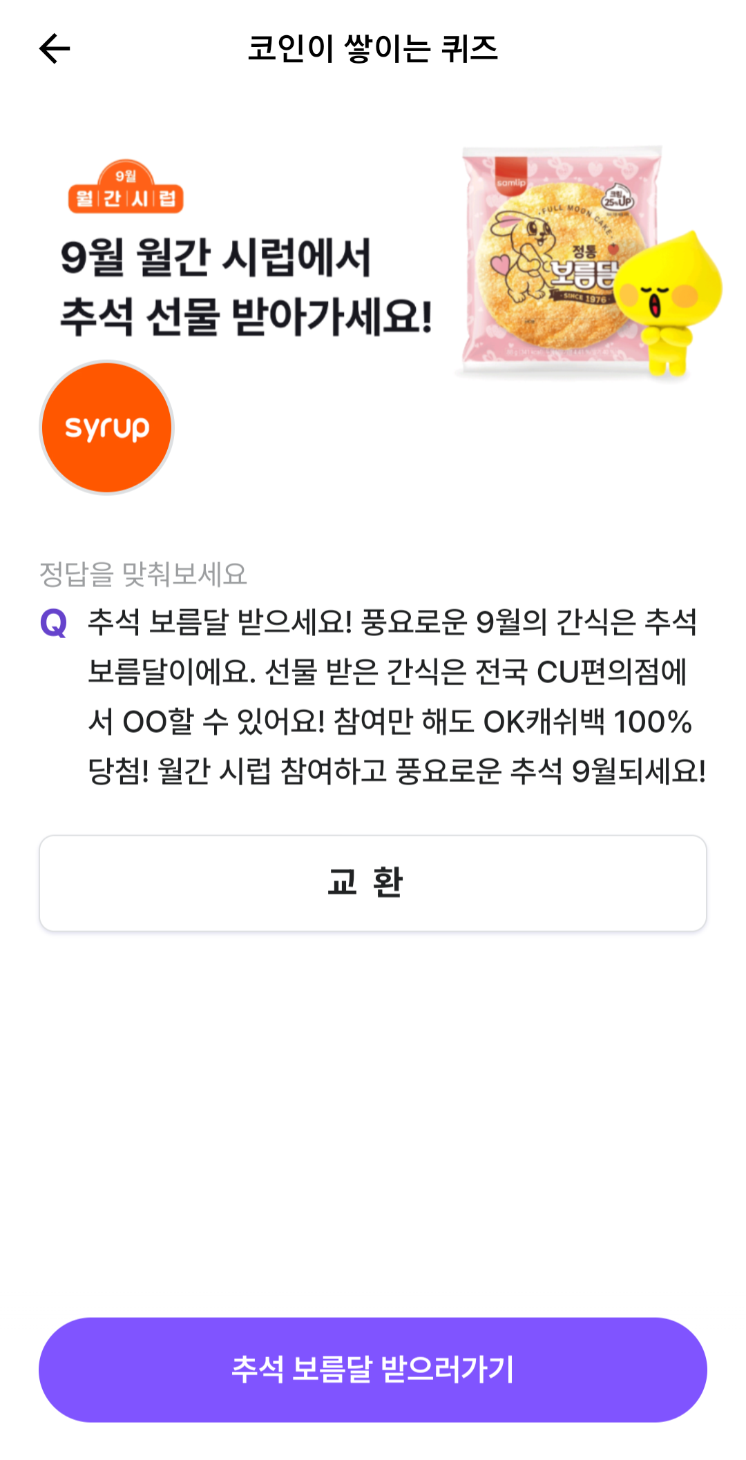추석 보름달 받으세요! 풍요로운 9월의 간식은 추석 보름달이에요. 선물 받은 간식은 전국 CU편의점에 서 OO할 수 있어요! 참여만 해도 OK캐쉬백 100% 당첨! 월간 시럽 참여하고 풍요로운 추석 9월되세요!