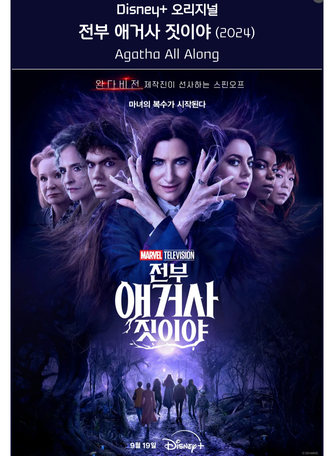 《전부 애거사 짓이야》(영어: Agatha All Along)는 마블 스튜디오가 디즈니+를 위해 제작한 미국의 텔레비전 미니시리즈입니다. 이 작품은 《완다비전》(2021)의 스핀오프로, 마블 시네마틱 유니버스(MCU)의 일환으로 제작되었습니다.