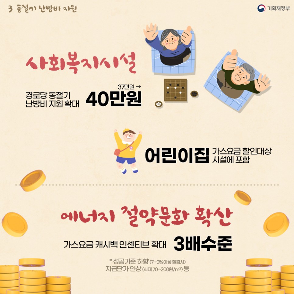 경로당 등 복지시설에 동절기 난방비 지원을 확대하고 어린이집을 도시가스 요금할인 대상 시설에 신규로 추가합니다.