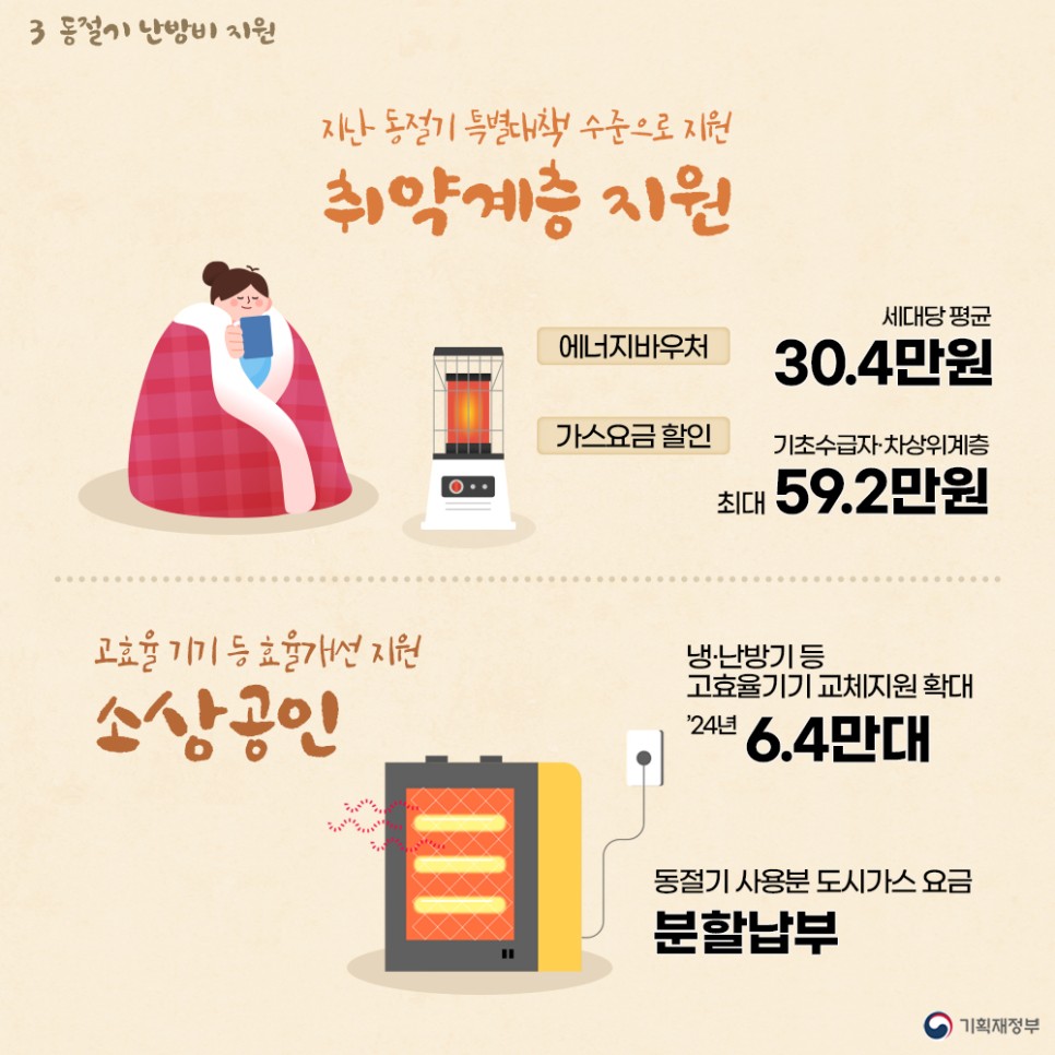- (가스·열요금 할인) 기초수급자 전체 및 차상위계층을 포괄하여 동절기(12~3월) 요금경감을 지난해와 같이 최대 59.2만원 적용할 계획입니다.