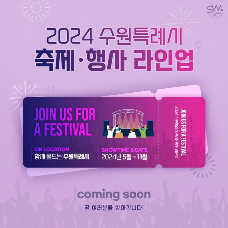2024 수원 축제의 프로모션 티켓 이미지로, 축제의 세부 사항이 잘 나타나 있어요.