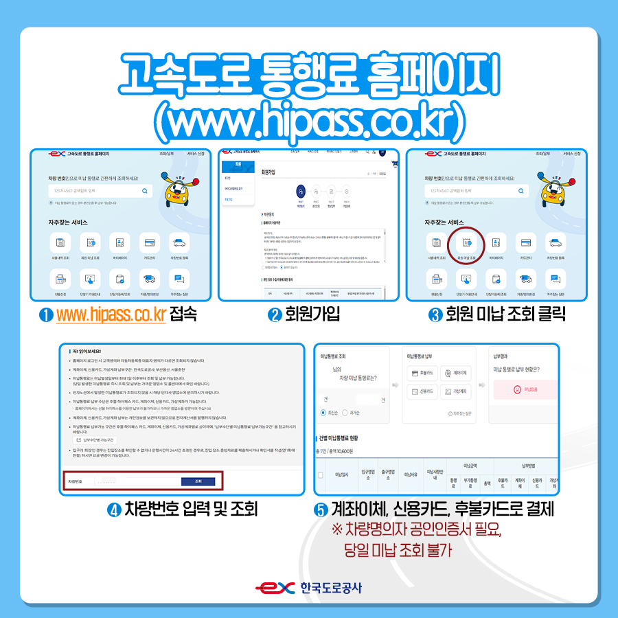 - 모바일 앱 이용하기 : '고속도로 통행료' 앱을 통해 쉽게 결제 가능합니다. 앱을 다운로드한 후 차량 정보를 입력하면 미납금 조회 및 결제가 가능합니다.