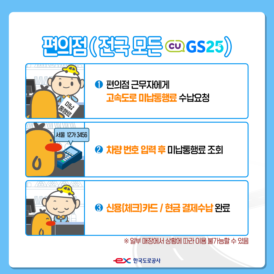 - 편의점 결제 : 가까운 CU 또는 GS25와 같은 편의점에서도 미납금 결제가 가능합니다. 점원에게 요청 후 차량 번호를 입력하여 결제하면 됩니다.