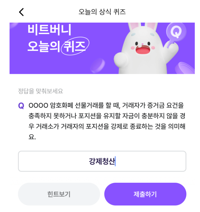 비트머니 퀴즈 12월 21일 정답은 바로 '강제청산' 입니다.
