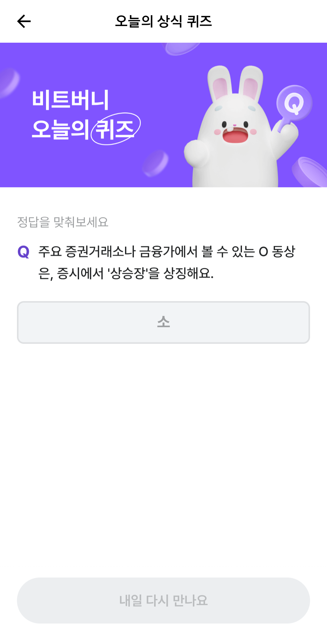 비트버니 '오늘의 상식 퀴즈'는 매일 오전 12시부터 하루동안 진행이 되는 퀴즈로 정답을 맞출 시 최대 100C(코인)을 획득할 수 있습니다.