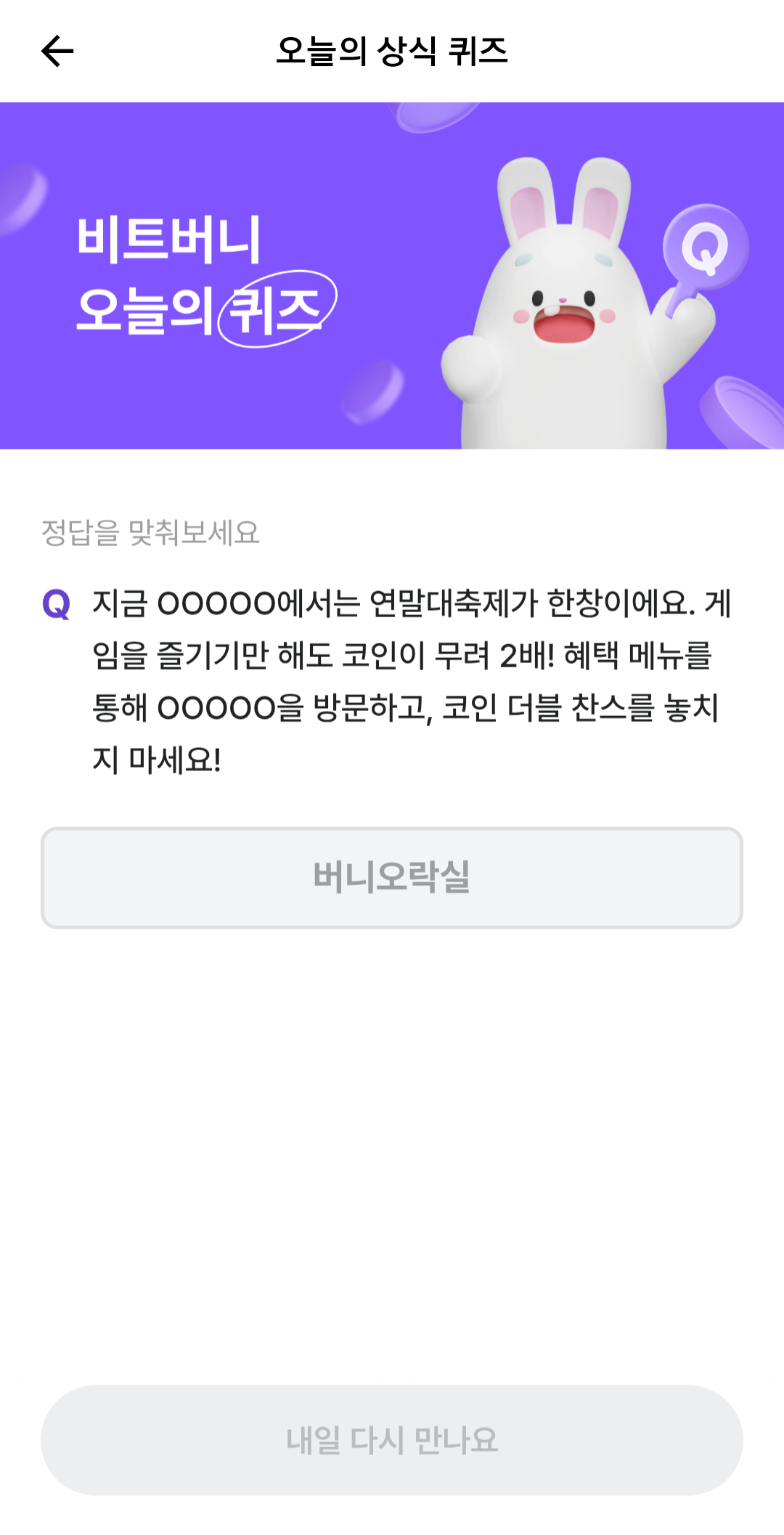 비트버니 '오늘의 상식 퀴즈'는 매일 오전 12시부터 하루동안 진행이 되는 퀴즈로 정답을 맞출 시 최대 100C(코인)을 획득할 수 있습니다.