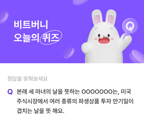 #12월28일 출제된 비트버니퀴즈는 "본래 세 마녀의 날을 뜻하는 O000000는, 미국주식시장에서 여러 종류의 파생상품 투자 만기일이겹치는 날을 뜻 해요." 다