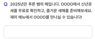 12월 29일 출제된 비트버니퀴즈는 "2025년은 푸른 뱀의 해입니다. 0000에서 신년운세를 무료로 확인하고, 즐거운 새해를 준비해보세요.재미 메뉴에서 OOOO를 만나실 수 있습니다!" 다
