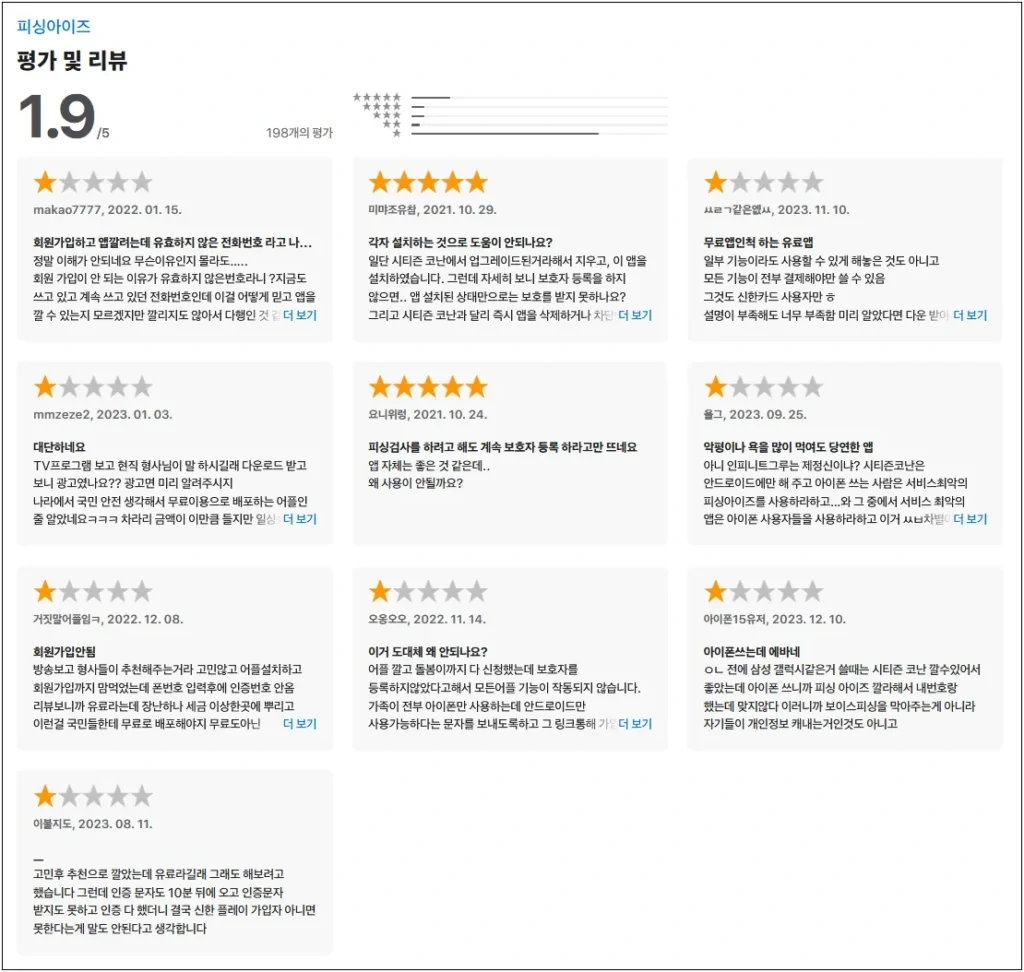 사용자 리뷰를 분석해보면, 대부분의 사용자들은 시티즌코난이 제공하는 보안 기능에 만족하고 있지만, 몇몇은 앱의 사용성이나 기능에 대한 불만을 표출하고 있습니다. 일부 리뷰에서는 앱이 작동하지 않거나, 경고가 과도하다는 피드백도 존재합니다. 2021년부터 2023년까지 작성된 리뷰들을 살펴보면, 사용자들이 지속적으로 앱의 개선을 요구하고 있는 상황을 알 수 있습니다.