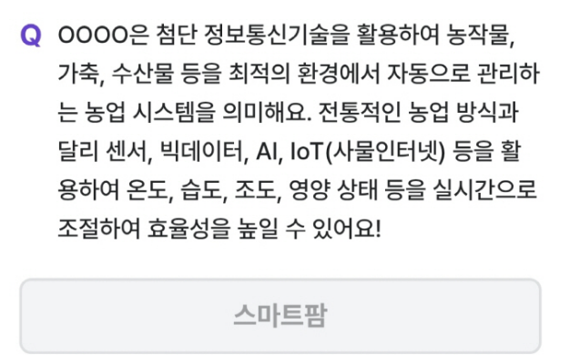 이번 퀴즈의 문제는 첨단 정보통신 기술을 활용한 농업의 자동화 관리에 대한 질문"이었어요. 문제의 핵심은 스마트팜에 대한 내용이었답니다. 스마트팜은 IoT, AI, 빅데이터 등을 활용하여 농작물과 가축을 효율적으로 관리하는 시스템을 말해요.