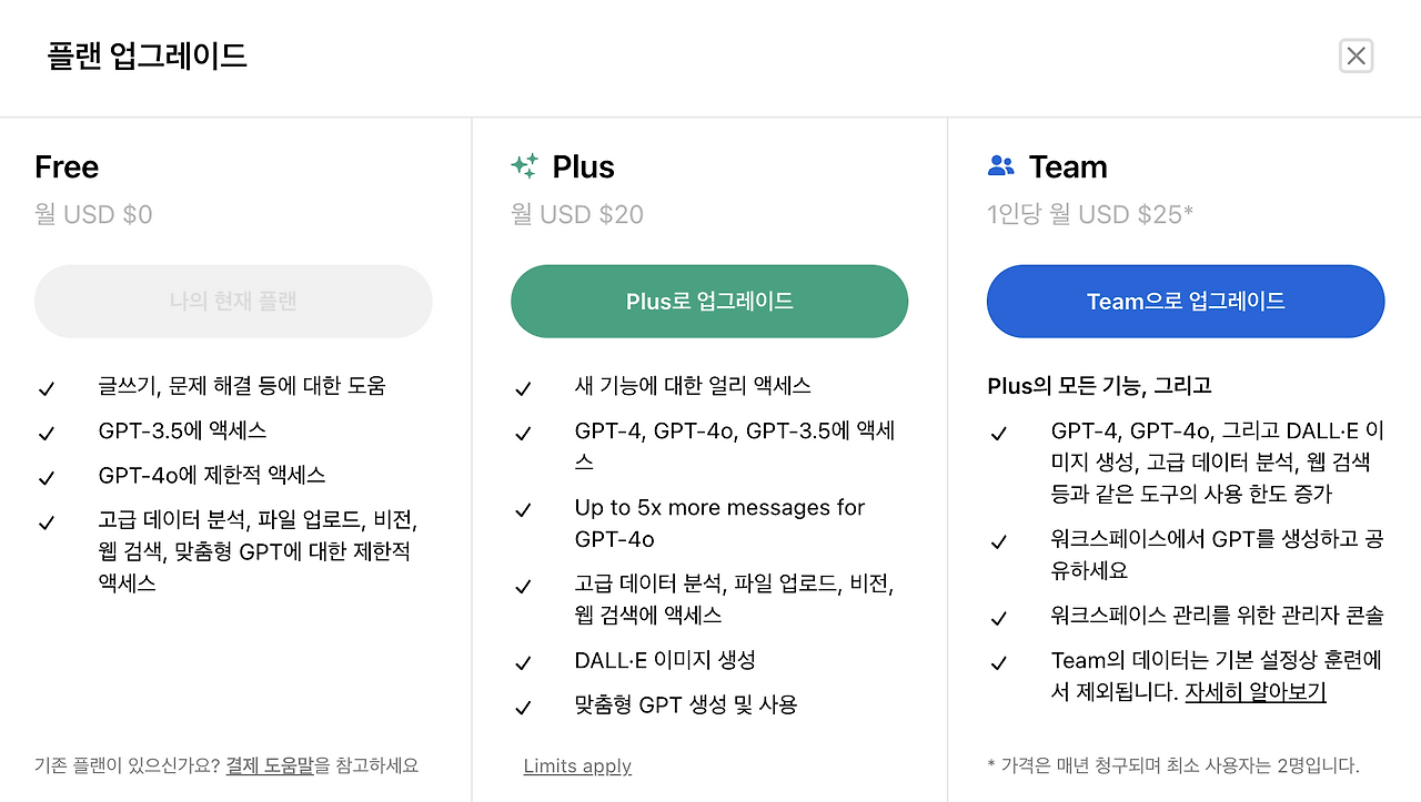ChatGPT의 요금제 비교