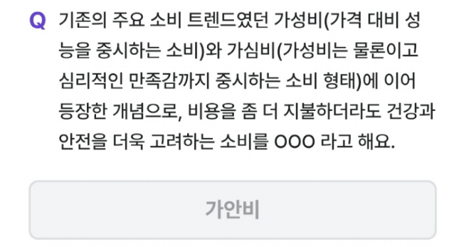 이번 퀴즈는 "가성비"와 "가심비"를 비교하는 질문으로 시작했어요. 소비자들이 건강과 안전을 우선시하는 새로운 소비 트렌드에 대한 질문이었죠. 특히, "가안비"라는 용어가 등장하면서 많은 사람들이 이 새로운 소비 트렌드에 대해 생각해보게 되었어요.