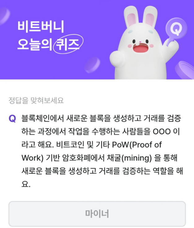 비트머니 퀴즈 3월 15일 정답은 바로 '마이너' 입니다.