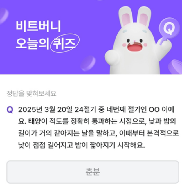 비트머니 퀴즈 3월 20일 정답은 바로 '춘분' 입니다.