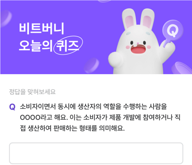 이날 출제된 퀴즈는 "소비자이면서 동시에 생산자의 역활을 수행하는 사람을 OOOO라고 해요."을 주제로 한 내용이었어요. 문제는 다음과 같았죠