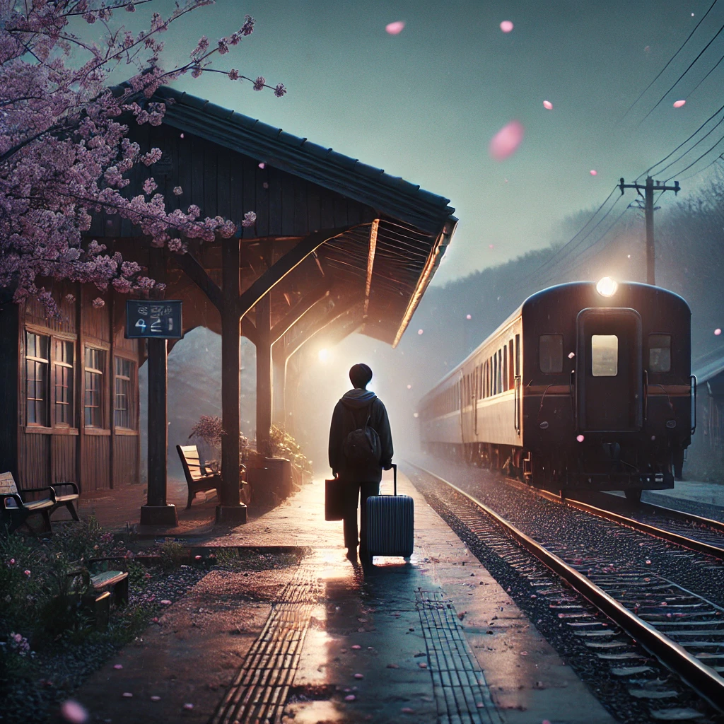 처음 장면, 낡은 기차역에 내려 아무 말 없이 걷는 주인공.