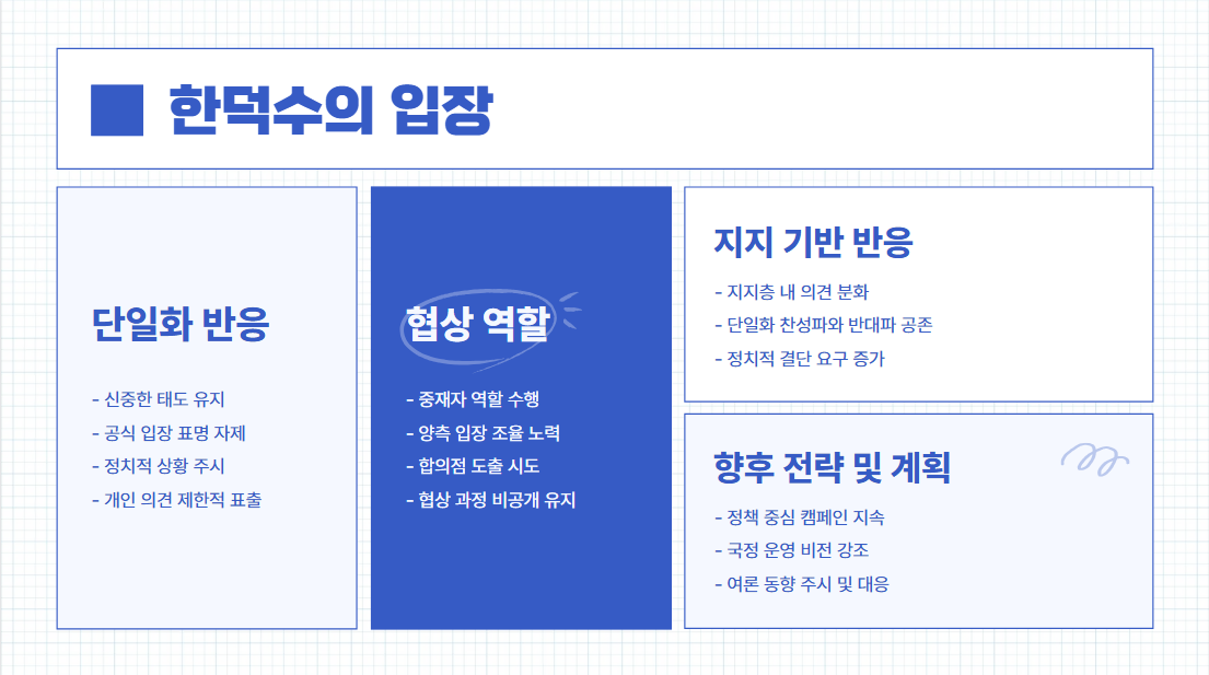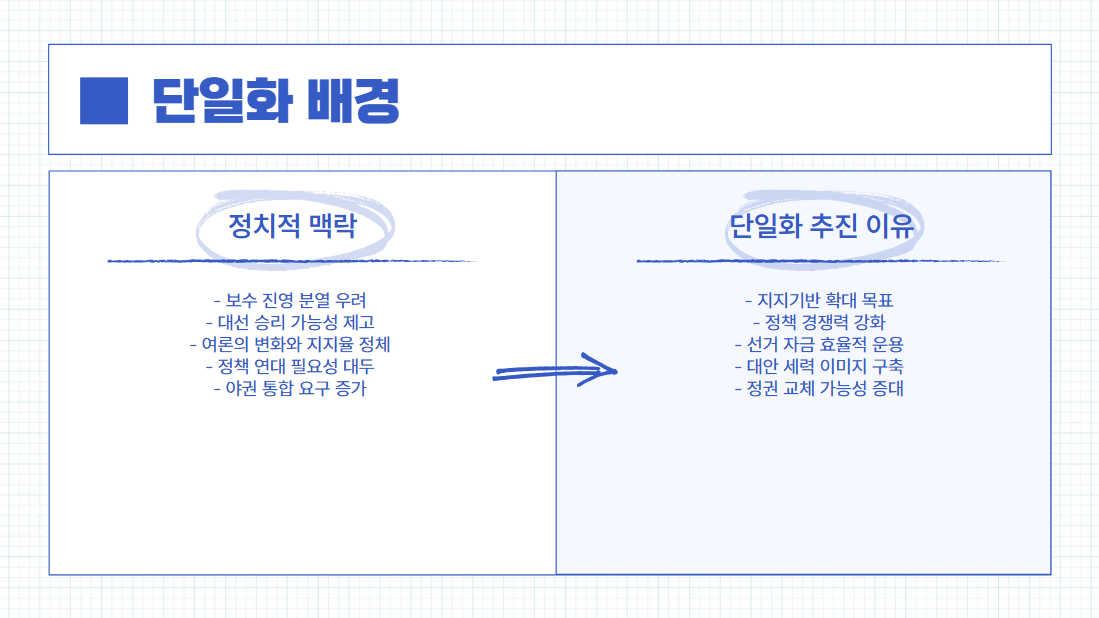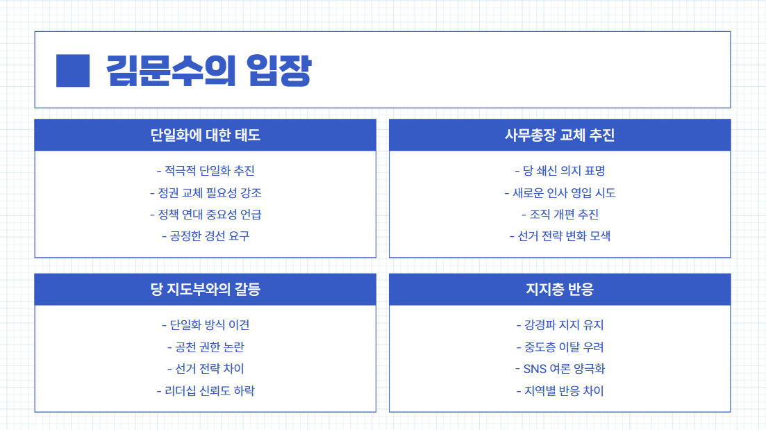 2025년 대선을 앞두고 보수진영은 내부 분열을 봉합하고자 김문수 후보와 한덕수 전 총리 간 단일화를 시도했으나, 단일화 방식에서의 극명한 차이로 인해 결국 결렬되었습니다. 김문수 측은 여론조사 100% 방식을 주장했고, 한덕수 측은 역선택 방지 조항이 포함된 구조적 방식 또는 당원 투표 반영을 요구하며 팽팽히 맞섰죠. 이견 조율 실패로 양측은 협상을 종료하고 독자 출마를 선언했습니다.