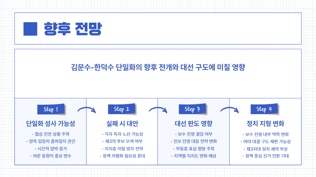 이번 단일화 파동은 국민의힘의 대선 전략에 큰 타격을 주었습니다. 분열된 보수표가 그대로 양분될 경우, 민주당 후보에게 유리한 구도가 형성될 수 있죠. 특히 보수 지지층의 혼란과 이탈이 우려되는 가운데, 김문수 전 후보 측 지지자들이 무소속 출마나 제3세력 연대를 선택할 가능성도 제기되고 있습니다. 이런 내부 갈등은 국민의힘의 결집력을 약화시키고, 중도층 확장에도 장애가 될 수 있어요.