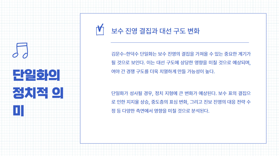 김문수-한덕수 사태는 단순한 후보 교체가 아니라, 정치 정당 시스템의 구조적 허점을 드러낸 상징적인 사건이었습니다. 이대로라면, 국민의힘은 차기 대선뿐만 아니라 중장기적으로 당의 정체성과 정당성을 잃을 수 있습니다. 정치의 본질은 신뢰와 과정입니다. 빠르게 수습하는 것도 중요하지만, 그보다 더 중요한 건 같은 실수를 반복하지 않기 위한 제도적 장치 마련입니다. 정치의 미래는, 정당의 진화에 달려있습니다.