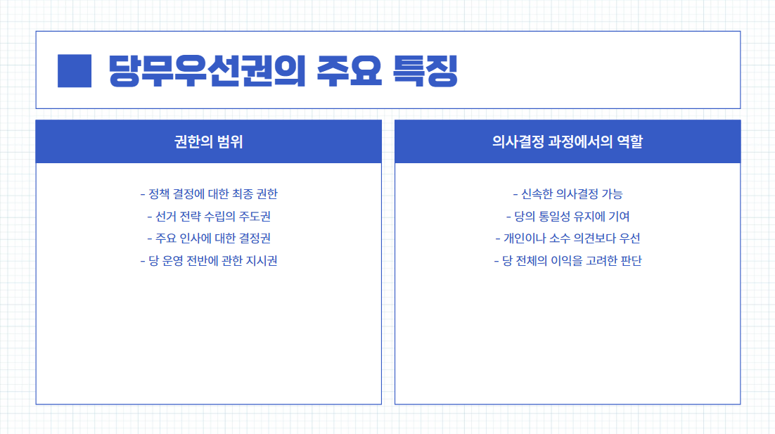 결국 권한을 행사하는 방식과 절차가 당내 신뢰와 연계되기 때문에, 당무우선권을 사용하는 순간은 매우 민감하고 중요합니다.