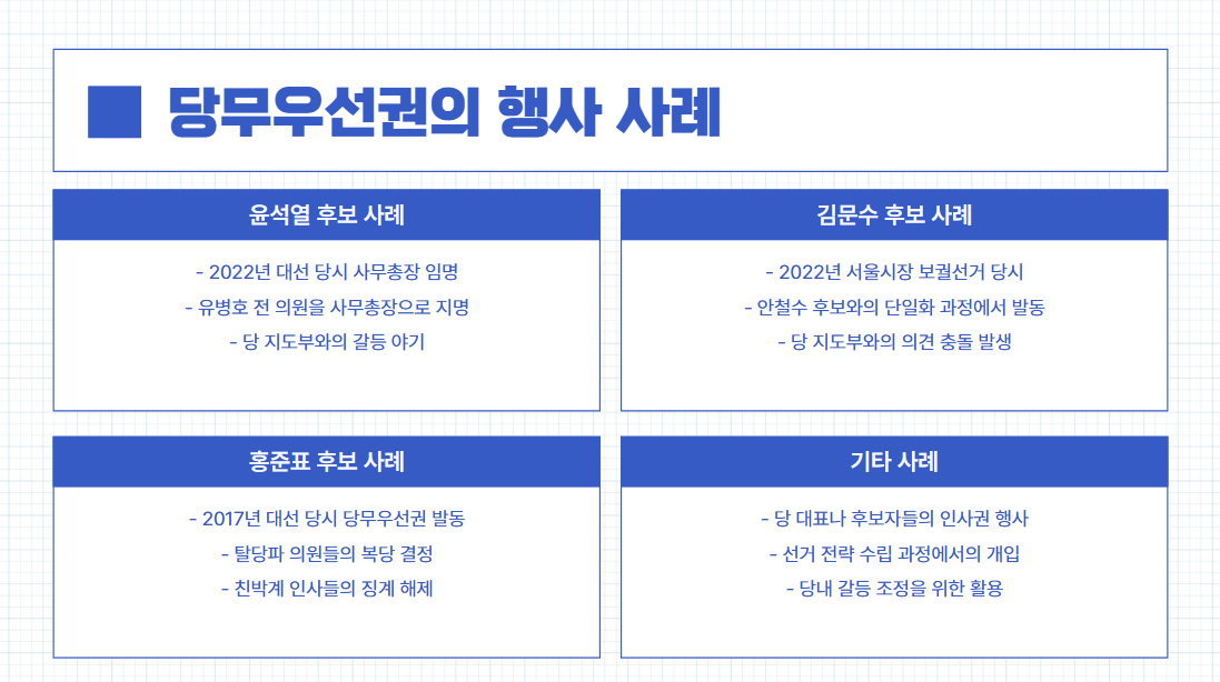 보통 공천 경쟁, 경선 방식, 비상대책위 구성, 중대한 사안에서 당내 의견이 갈릴 때 사용돼요. 예를 들어 두 후보가 서로 "내가 당의 대표 후보다"라고 주장하면, 당대표가 당무우선권을 발동해서 “최종 결정은 이쪽이다!”라고 선언할 수 있는 거죠. 이걸 당헌과 당규에 따라 행사하게 됩니다.