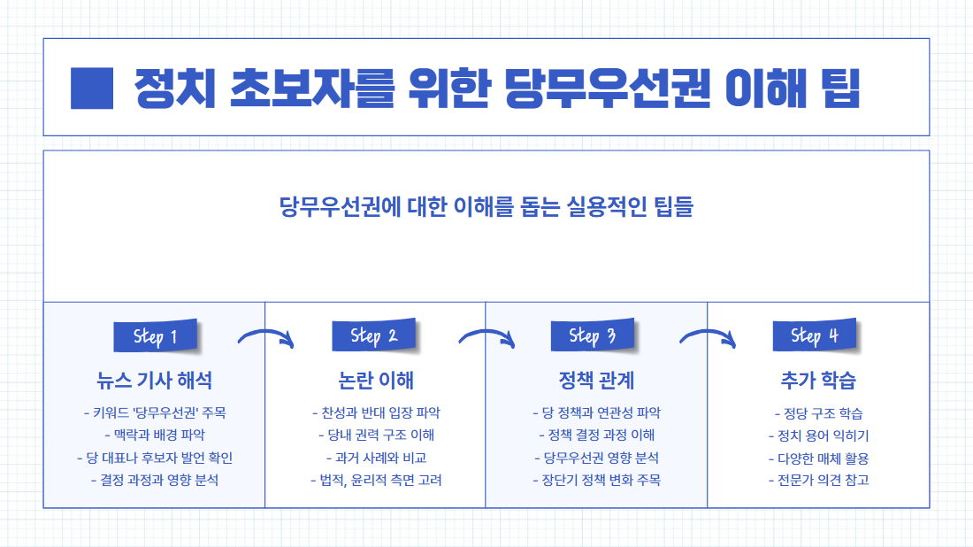 당무우선권이라는 단어가 처음엔 어렵게 느껴질 수 있지만, 알고 보면 정당 안에서 '누가 최종 결정권을 가지는가'를 정하는 개념이에요. 이 권한은 정당의 위기 상황에서 빠른 결정을 내릴 수 있도록 돕기도 하지만, 그만큼 절차와 민주주의를 무시할 수 있는 위험도 가지고 있죠. 정치는 결국 신뢰와 투명한 절차의 싸움입니다. 여러분이 이 개념을 이해하고, 정치 뉴스를 더 깊이 바라볼 수 있다면, 이미 훌륭한 한 걸음을 내디딘 거예요. 함께 꾸준히 공부해봐요!