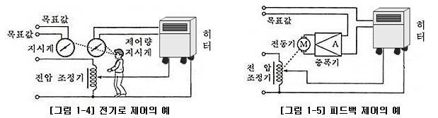 그림 1-4과 같이 히터 안의 온도를 일정하게 유지시키기 위하여 전압 조정기를 사용한 히터의 제어 회로에 있어서 시간에 따라 원하는 온도가 미리 정해진 목표값에 따라서 제어하려면 전압 조정기의 손잡이 위치를 조정하면 된다. 그러나, 경우에 따라서는 주위의 온도나 전원 전압의 변화 또는 가열 물질의 크기에 따라 히터 안의 온도가 변할 때가 있다. 이와 같이 목표값에 따라 제어하기 위해서는 히터 안의 온도, 즉 제어량의 지시와 목표값의 지시를 비교하여 히터의 온도를 일정하게 유지하는 되먹임 제어(Feedback Control)이다.