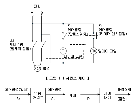 여기서, 전등을 '켜라' 또는 '꺼라'하는 외부에서 주어지는 명령을 실행하는 스위치 S1의 개폐를 작업 명령, 스위치T1의 개폐를 제어 명령이라 하며, 스위치 S1과 스위치 T1 사이에 있는 타이머에 의하여 작업 명령과 제어 명령 사이에 명령 처리가 이루어진다.