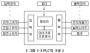 그림-1과 같이 인간의 두뇌에 해당하는 중앙 처리장치(CPU: Central Processing Unit), 기계와 설비 장치의 신호를 주고 받는 입·출력(I/O) Input/Output), 시퀀스 회로의 내용에 해당하는 프로그램을 기억하는 기록부의 향상을 위한 주변 기기(프로그램 로더, EPROM Writer 등)로 구성된다.